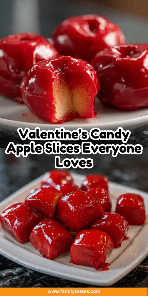 There’s something magical about homemade Valentine’s Day treats, especially when they involve candy apple slices! I still remember my mom making these for my first-grade Valentine’s party, her kitchen smelling like caramelized sugar and cinnamon. She’d arrange the ruby-red slices on a heart-shaped platter, each one glistening with that perfect candy coating. Now I carry on that sweet tradition, making these for my own family and friends. Nothing says “I love you” quite like sharing something made by hand, and these candy apple slices are my favorite way to spread the love. They’re easier than whole candy apples but just as festive and delicious!