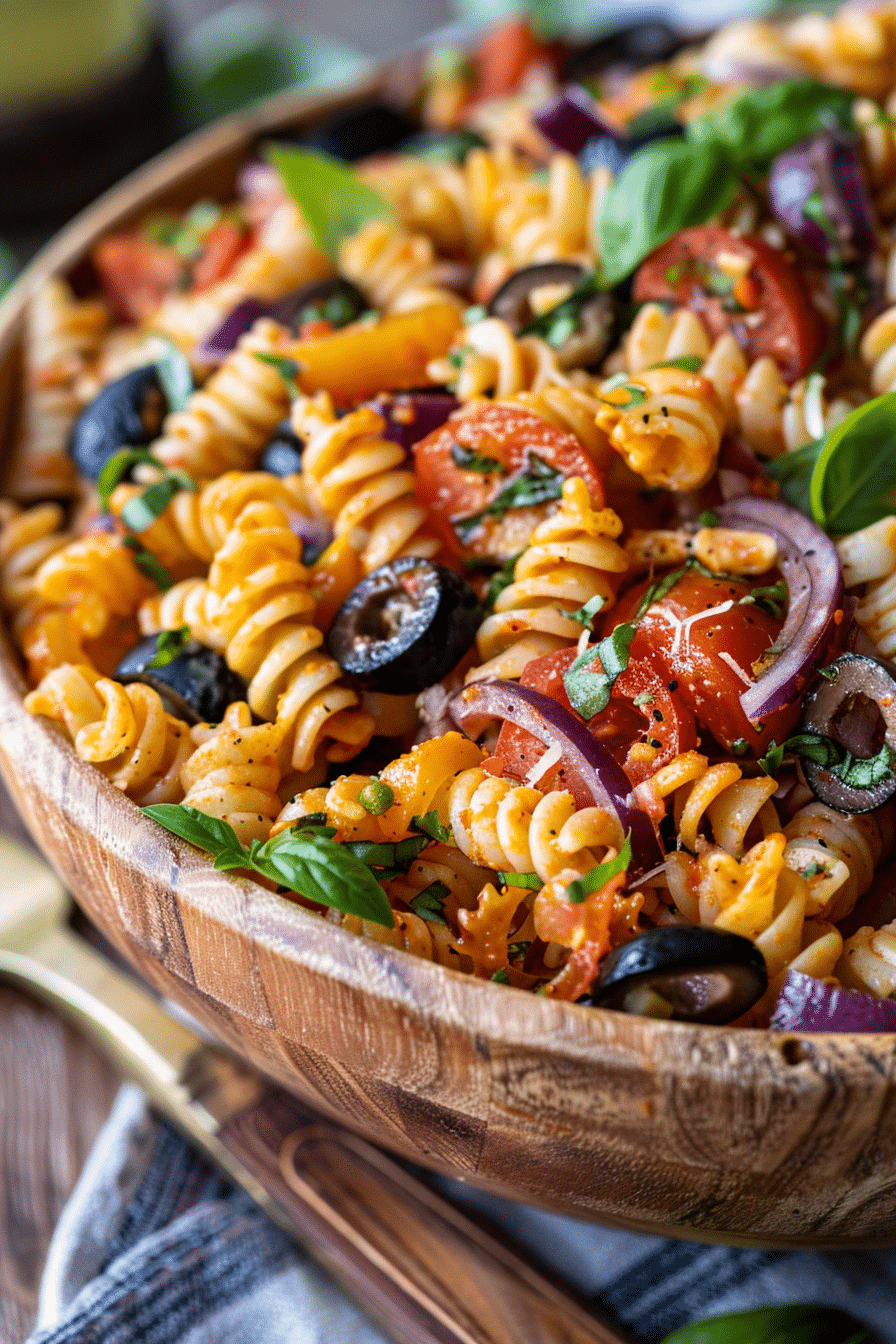 A vibrant Italian-American pasta salad combining al dente rotini, fresh veggies, mozzarella, and zesty dressing. Packed with crisp cucumber, cherry tomatoes, briny olives, and turkey pepperoni, it’s a healthy picnic standout.