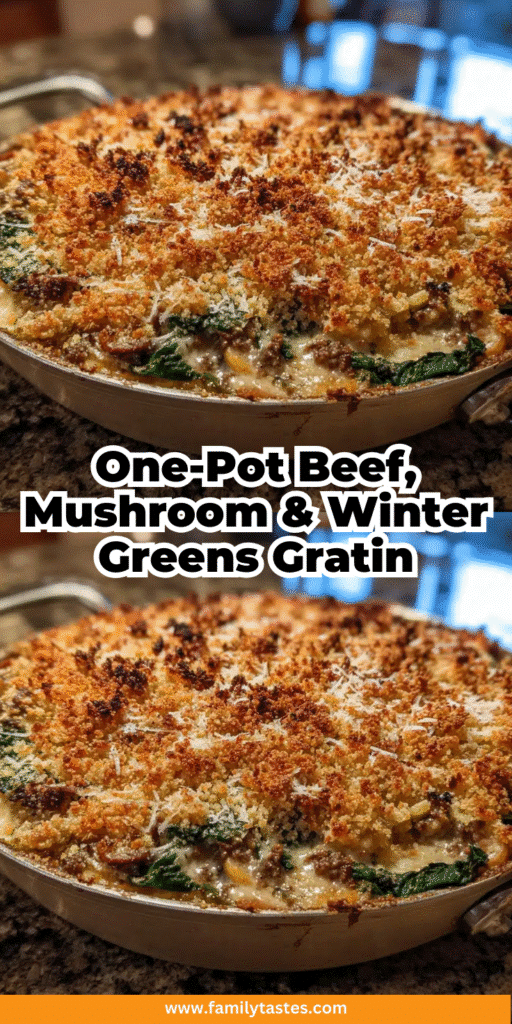 One‑Pot Beef, Mushroom & Winter Greens Gratin