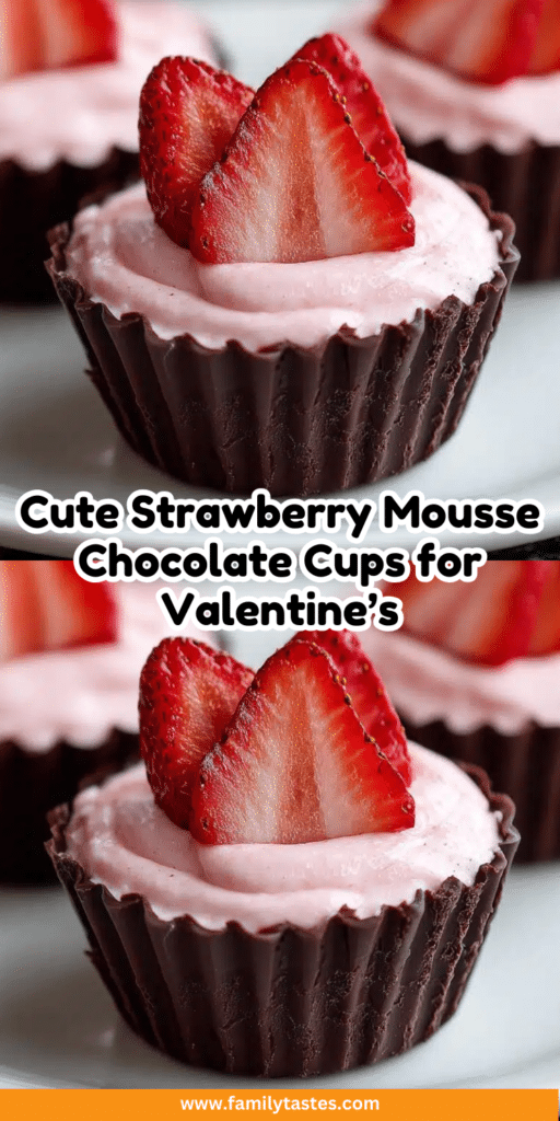 Delicious Valentine’s Day treats featuring strawberry mousse in chocolate cups.